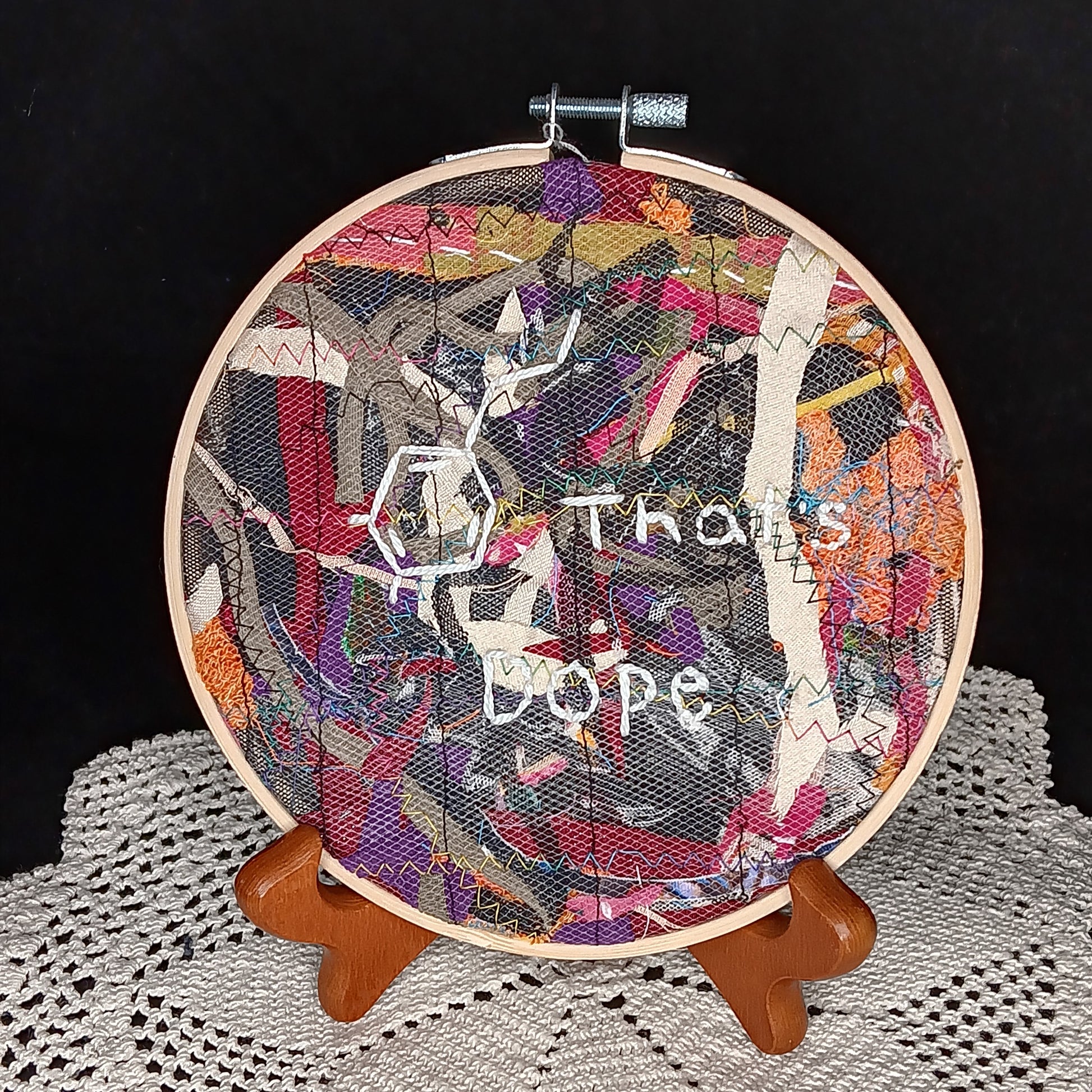 This is a hand embroidered pun and molecule.